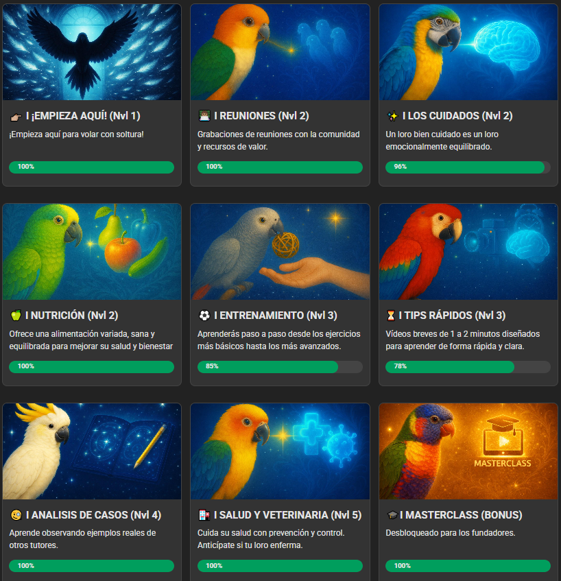 He creado una comunidad con un propósito muy claro: reunir a personas apasionadas por los loros que desean aprender, compartir y mejorar cada día en el cuidado y entrenamiento de sus aves. Encontrarás contenido muy valioso que te permitirá aprender y entender a tu loro.